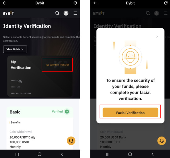 " Identituy Transfer " 클릭 후 안면 인증 메시지가 뜨면 " Facial Verification "을 클릭해 줍니다.